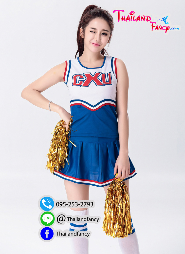 ชุดคอสเพลย์เชียร์กีฬา ชุดแฟนซีปอมปอมเชียร์ Cheerleader Pom Pom Cosplay ชุดเชียร์ลีดเดอร์ ชุดกีฬาสี สีน้ำเงินแขนขาว กระโปรงจีบ
